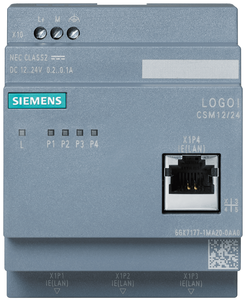 LOGO! CSM12/24 Compact Switch modulo collegamento di ununità LOGO! (. ..0BA7/...0BA8) e di fino a 3 ulteriori nodi a Industrial Ethernet con 10/100 MBit/s switch unmanaged, 4 porte RJ45 1x porta frontale per la diagnostica DC alimentazione di tensione 12/24V diagnostica LED, configurazione LOGO! SCALANCE LOGO! Modulo switch compatto CSM 12/24, switch unmanaged, 4x RJ45 da 10/100 Mbit/s, 1x porta frontale per il collegamento di un LOGO! a IE. Realizzazione di piccole reti Ethernet locali. La realizzazioneeconomica di piccole reti Industrial Ethernet locali consente di risparmiare sui costi di montaggio e sullo spazio di installazione rispetto alluso di un componente di rete esterno. Possibilità di ampliamento flessibile della rete grazie al semplice inserimento del CSM. Messa in servizio rapida, poiché non è necessaria alcuna progettazione, nonché accesso veloce e senza complicazioni alla diagnostica nel quadro elettrico. Supporto dellimpiego stand-alone come switch unmanaged a 4 porte per linterconnessione in rete di qualsiasi apparecchiatura Ethernet. LED per la diagnostica e la visualizzazione di stato delle porte Industrial Ethernet. Compact Switch Module per il collegamento di un LOGO! e di fino a 3 ulteriori nodi a Industrial Ethernet con unmanagedswitch 10/100 Mbit/s, 4x porte RJ45, 1x porta frontale per diagnostica, DC 12/24V. Il sistema è completato da un IE FC Outlet RJ45 e diverse varianti di cavi di collegamento.