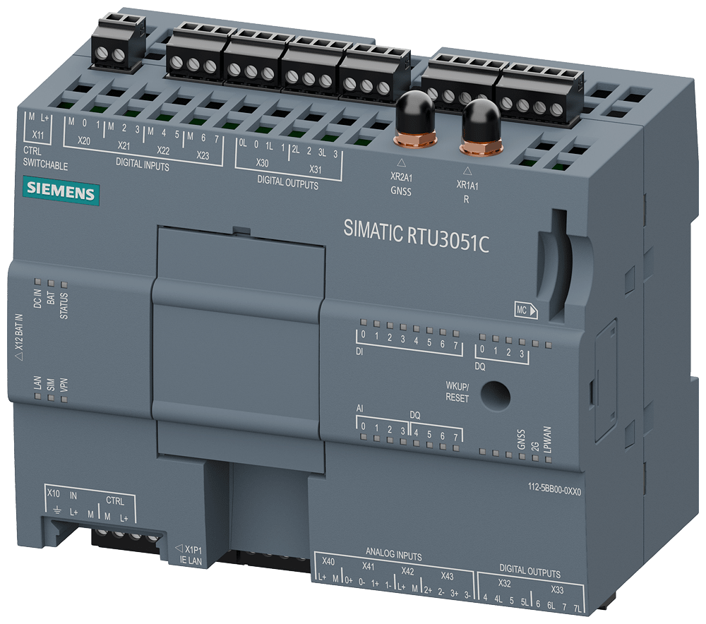 SIMATIC RTU3051C compatta Low-Power RTU; funzionante a batteria oppure con energia fotovoltaica; collegamento alimentazione di tensione est. DC 10,8V... 28,8V; modem integrato per LTE-M/NB-IoTv2; GNSS; collegamento a TeleControl Server Basic; protocolli caricabili: DNP3, IEC 60870-5-104, SINAUT ST7 oppure MQTT; I/O onboard: 8 DI, 8 DO, 4AI; client FTP; porta Ethernet, configurazione / diagnostica tramite Web server, sincronizzazione dellora, SMS, e-mail, slot schede SD. osservare le omologazioni nazionali! RTU Low Power compatta SIMATIC RTU3051C; alimentata da batteria o da pannello solare; collegamento dellalimentazione di tensione esterna da DC 10,8 V a 28,8 V; modem integrato per LTE-M/NB-IoTv2; GNSS; collegamento a TeleControl Server Basic; protocolli caricabili: DNP3, IEC 60870-5-104, SINAUT ST7 o MQTT; I/O onboard: 8 DI, 8 DO, 4 AI; FTP Client; porta Ethernet, configurazione / diagnostica tramite Web Server, sincronizzazione dellora, SMS, e-mail, slot per SD. Osservare le omologazioni nazionali!