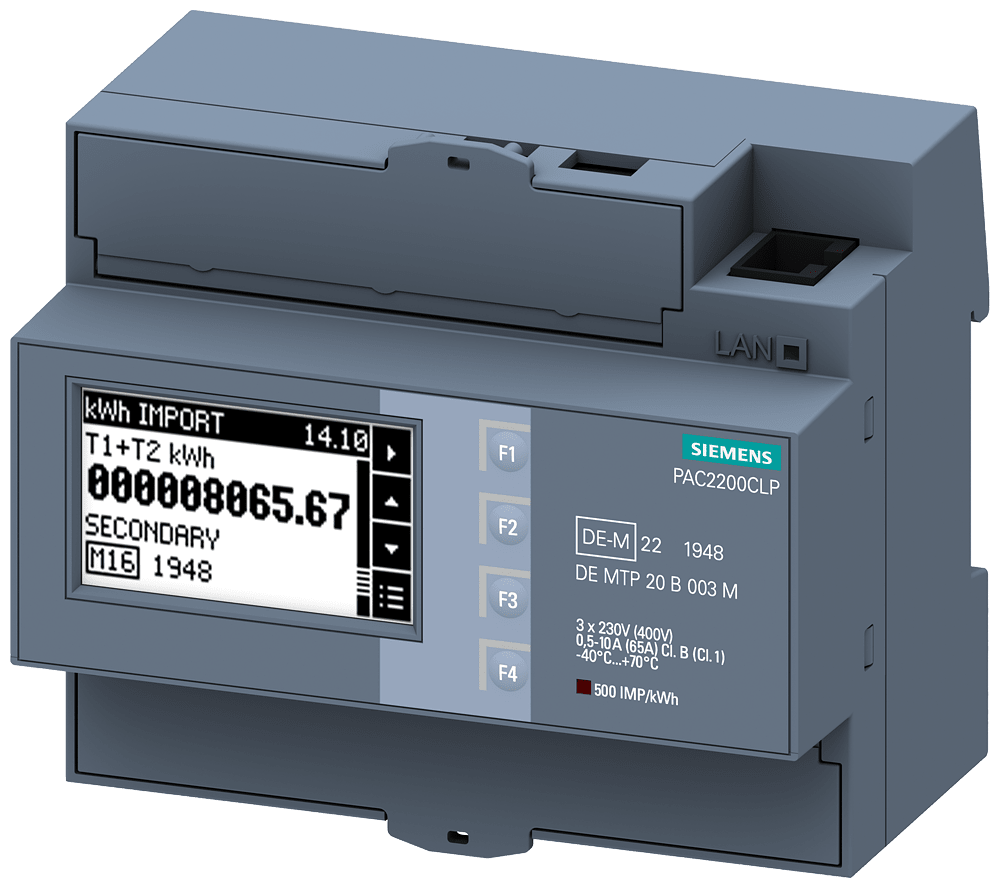 dispositivo di misura SENTRON PAC2200-CLP L-L:400V, L-N:230V, 65A diretto apparecchio per montaggio su guida DIN, 6UM, trifase interfaccia LAN, Modbus-TCP display LC, omologazione MID collegamento a vite, autoalimentato energia apparente / attiva / reattiva memoria certificata dellandamento del carico conforme alla legge di misura e di calibrazione secondo PTB-A 50.7 Contatore di energia SENTRON 7KM PAC2200 per la misura con taratura fiscale del fabbisogno energetico in reti monofase e trifase, ad es in impianti industriali, edifici funzionali, uffici e appartamenti in condomini, a scopo di fatturazione con profilo dellandamento del carico certificato (conforme alla normativa sulla taratura secondo PTB-A50.7). I dispositivi di misura dellenergia 7KM PAC 2200 tarati secondo MID e PTB 50.7 (CLP) con gamma di funzioni ampliata, rilevano in modo preciso, riproducibile e affidabile i valori di energia per alimentazione, partenze elettriche o singoli utilizzatori attraverso la misura con trasformatori o diretta fino a 65 A. Essi forniscono non solo informazioni complete sulla vostra installazione elettrica e sulla distribuzione dellenergia ma anche valori di misura importanti per la valutazione dello stato dellimpianto. Per lulteriore elaborazione dei dati di misura i dispositivi sono facilmente integrabili, grazie alle loro molteplici possibilità di comunicazione, in sistemi sovraordinati di automazione e di gestione dellenergia tramite Modbus TCP e PROFINET. I dispositivi di misura 7KM PAC sono disponibili in diverse varianti, adatte a soddisfare le vostre esigenze. SENTRON PAC - Gli specialisti nellacquisizione di valori di misura.