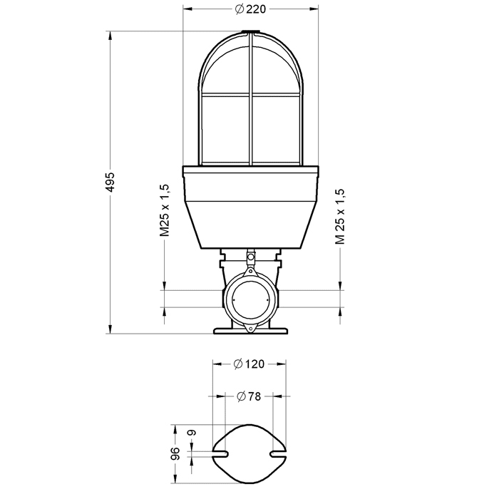 Luce rotante di tipo tradizionale, in versione con lampadina a filamento. Dispositivo di grandi dimensioni, ideale sia per la segnalazione cambio stato operativo di macchinari, sia per l'allertamento o la segnalazione di condizioni di pericolo in ambienti con atmosfera esplosiva. Progettato secondo la normativa ATEx, ROTALLARM può essere utilizzato in aree esplosive del Gruppo II, Zone 1, 2, 21 e 22. II 2GD Ex de IIC T6 Ex tD A21 IP66 T85 °C. Omologazione: CESI 05 ATEX 043. Corpo in lega di alluminio esente da rame. Verniciatura poliestere RAL 3020. Protezione: IP 66. Temperatura massima superficiale: T6