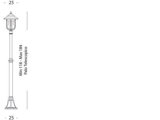Palo in pressofusione di alluminio. Diffusore in termoplastico trasparente. Triangolo di fissaggio a terra. Altezza max lampada: 185mm. Alimentazione 230 V ~ 50 Hz. Classe di protezione: IP43 Potenza massima lampade: 100W