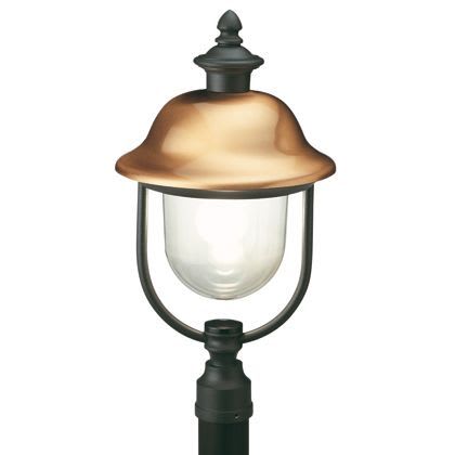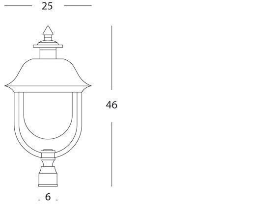 Testa-palo con struttura in pressofusione di alluminio. Copertura superiore in rame. Diffusore in termoplastico trasparente. Manicotto diametro: 60mm. Altezza max lampada: 150mm. Alimentazione 230 V ~ 50 Hz. Classe di protezione: IP43 Potenza massima lampade: 100W