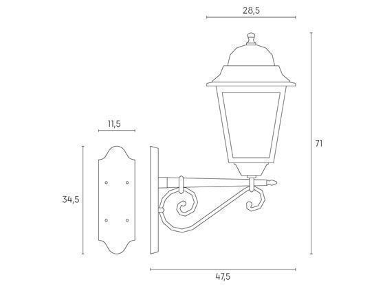 Struttura in pressofusione di alluminio. Diffusori in vetro trasparente. Controbase e accessori per il fissaggio. Portalampada in porcellana con attacco E27. Altezza lampada: max 240mm. Lampada esclusa. Alimentazione 230V ~ 50Hz. Classe di protezione: IP43 Potenza massima lampade: 100W