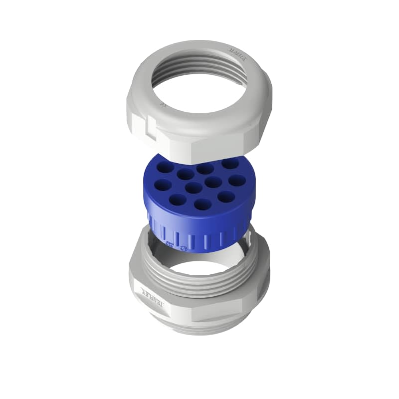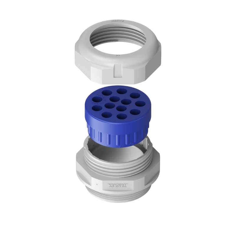 Pressacavo industriale multiforo in poliammide, questo pressacavo permette l’installazione di più cavi con ∅ esterno uguale consentendo un notevole risparmio di spazio. I fori dei gommini con la S finale non sono passanti IP68.