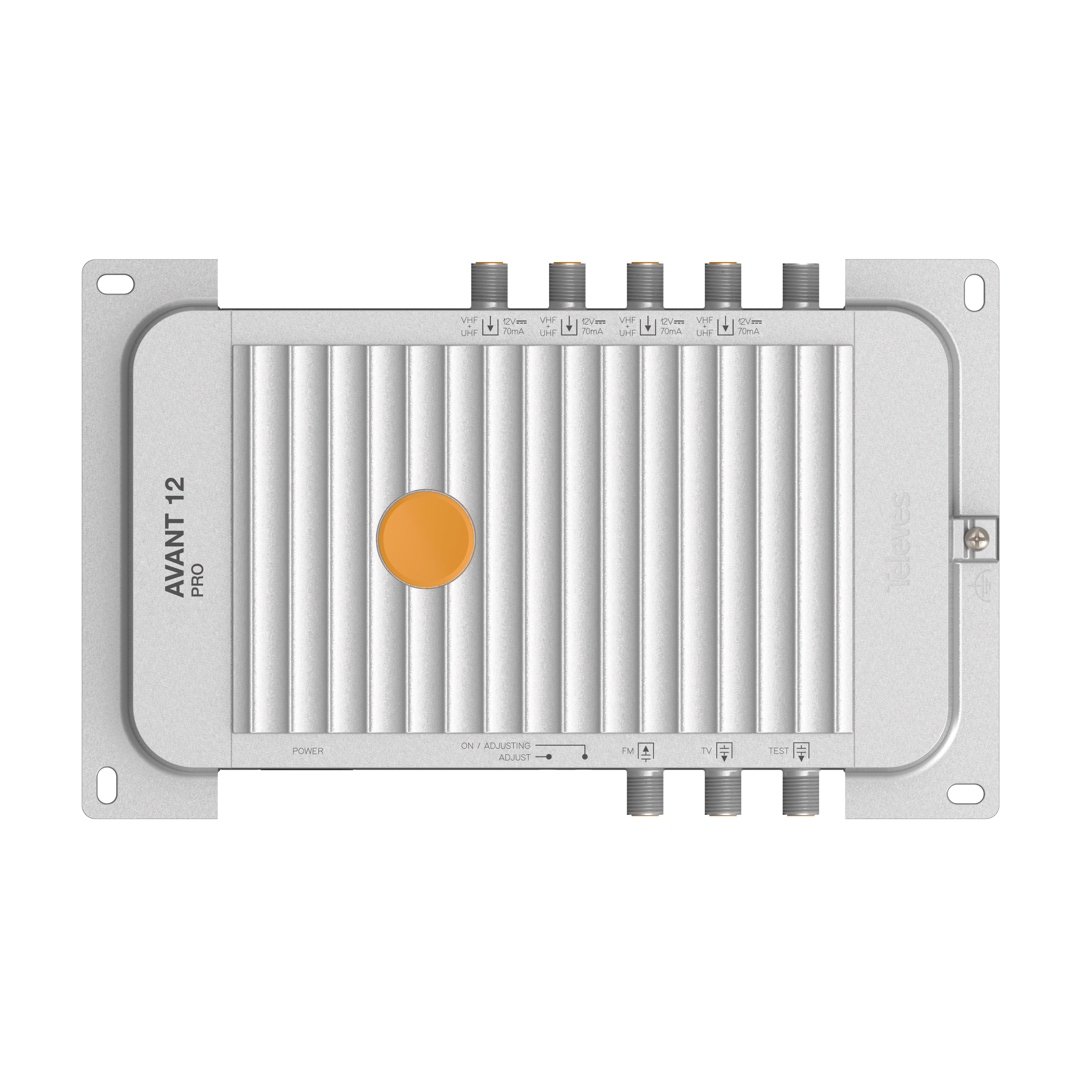 AVANT 12 PRO amplificatore multibanda programmabile terrestre, 32 filtri digitali e programmazione auto/avanzata via ASuite (Bluetooth®). Centrale di amplificazione multiingresso ideale per installazioni terrestri singole o condominiali, che consente di programmare individualmente i canali disponibili su 4 ingressi VHF+UHF (TDT), per un totale di 32 filtri digitali. La centrale ha 5 ingressi, configurabili in 2 modalità di distribuzione: FM-4x[VHF+UHF] o FM-DAB-3xUHF e consente di ottenere un'amplificazione ed equalizzazione programmabile da diversi ingressi RF. Inoltre, include il filtraggio 4G/5G, facendo sì che la centrale distingua proprio la programmazione dei filtri fino al canale 48 (LTE700).Grazie all'antenna Bluetooth® incorporata, è possibile realizzare una programmazione avanzata della centrale in wireless semplicemente da uno smartphone o tablet (Android/iOS), con l'applicazione ASuite. Mediante questa applicazione, l'utente professionista potrà realizzare molteplici funzioni:Programmazione dei filtri dei canali. Regolazione automatica del livello dei canali per bilanciare tutti i filtri. Regolazione manuale per ogni canale dopo la regolazione automatica. Attivazione dell'alimentazione per la ricezione delle antenne. Importazione/esportazionedelle configurazioni. Inoltre, include anche la funzione di autoprogrammazione, eseguibile da ASuite, con cui il dispositivo utilizza la sua intelligenza e si autoprogramma, cercando e selezionando i canali migliori e successivamente equalizzando il livello del segnale tra loro. Il modello PRO consente il monitoraggio del segnale VHF/UHF e genera report sull'installazione (scheda PDF).RED compliant . Con l'applicazione ASuite, la programmazione avanzata del dispositivo può essere eseguita in modalità wireless (Bluetooth®), facilmente e comodamente da uno smartphone o tablet (Android/iOS). Singolo dispositivo con 2 modalità di distribuzione: 4 ingressi supportano VHF/UHF, oppure un ingresso è per DAB e gli altri 3 per UHF. Alto livello di uscita: fino a128 dBµV (EN50083), per servire un gran numero di prese. Autoprogrammazione: con questa funzione disponibile in ASuite, il dispositivo esegue autonomamente l'assegnazione dei canali e la regolazione del livello, nonché l'attivazione dell'alimentazione di un'antenna attiva. Fino a 32 filtri programmabili individualmente, con filtraggio digitale individuale di ogni canale, compresi i canali adiacenti. Elaborazione digitale dei canali, con conseguente livello del segnale perfettamente bilanciato tra i diversi canali in uscita. Regolazione automatica del segnale in ogni filtro (AGC). Consente inoltre una regolazione fine del livello di uscita dopo l'equalizzazione. Filtri digitali VHF/UHF ad alta selettività: reiezione andgt;30dB (@ 1MHz). Filtro SAW (Surface Acoustic Wave) per il filtraggio dei segnali 4G/5G dal canale 48, con la migliore selettività e stabilità. compatibilità con DVB-T e DVB-T2 . Tecnologia TForce: il livello del segnale terrestre è sempre bilanciato e regolato sul valore ottimale.Passaggio di corrente agli ingressi per alimentare, le antenne attive. Indicatore di stato a LED e pulsante di autoregolazione fisico integrato nel pannello di controllo. Telaio ad alta schermatura (Zamak) perandnbsp;proteggere dalle interferenze elettromagnetiche. Dimensioni ridotte e compatteandnbsp;per un'unità di controllo ad alte prestazioni (196x122x43mm). Progettazione e produzione 100% europee: produzione completamente automatizzata e sottoposta a rigorosi controlli di qualità.