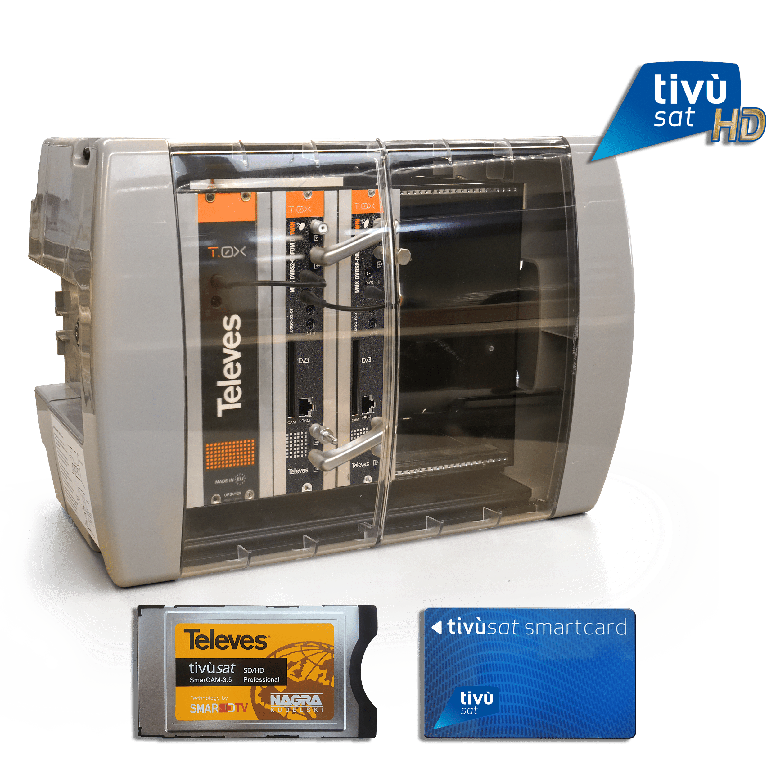 Kit TivùSat Small: Centrale di testa T.0X preconfigurata DVBS/S2 - COFDM, 16 programmi. Centrale di testa modulare ed espandibile, installata all’interno di un armadietto ventilato e dotato di serratura, con predisposizione per il montaggio a parete. Viene fornita già assemblata e programmata per ricevere i segnali dall' operatore TivúSat, con una configurazione di 16 programmi delle principali emittenti internazionali. Questo è possibile grazie a due moduli trasmodulatori (Art. 565401) che possono processare 8 transponder selezionabili da 4 diversi ingressi satellitari, in abbinamento alla PRO-Cam SD/HD (Art. 7161) e alla smart card multiutenza (Art. 716102) per la decriptazione dei programmi radio-televisivi. In uscita sono generati 4 MUX COFDM completamente indipendenti.