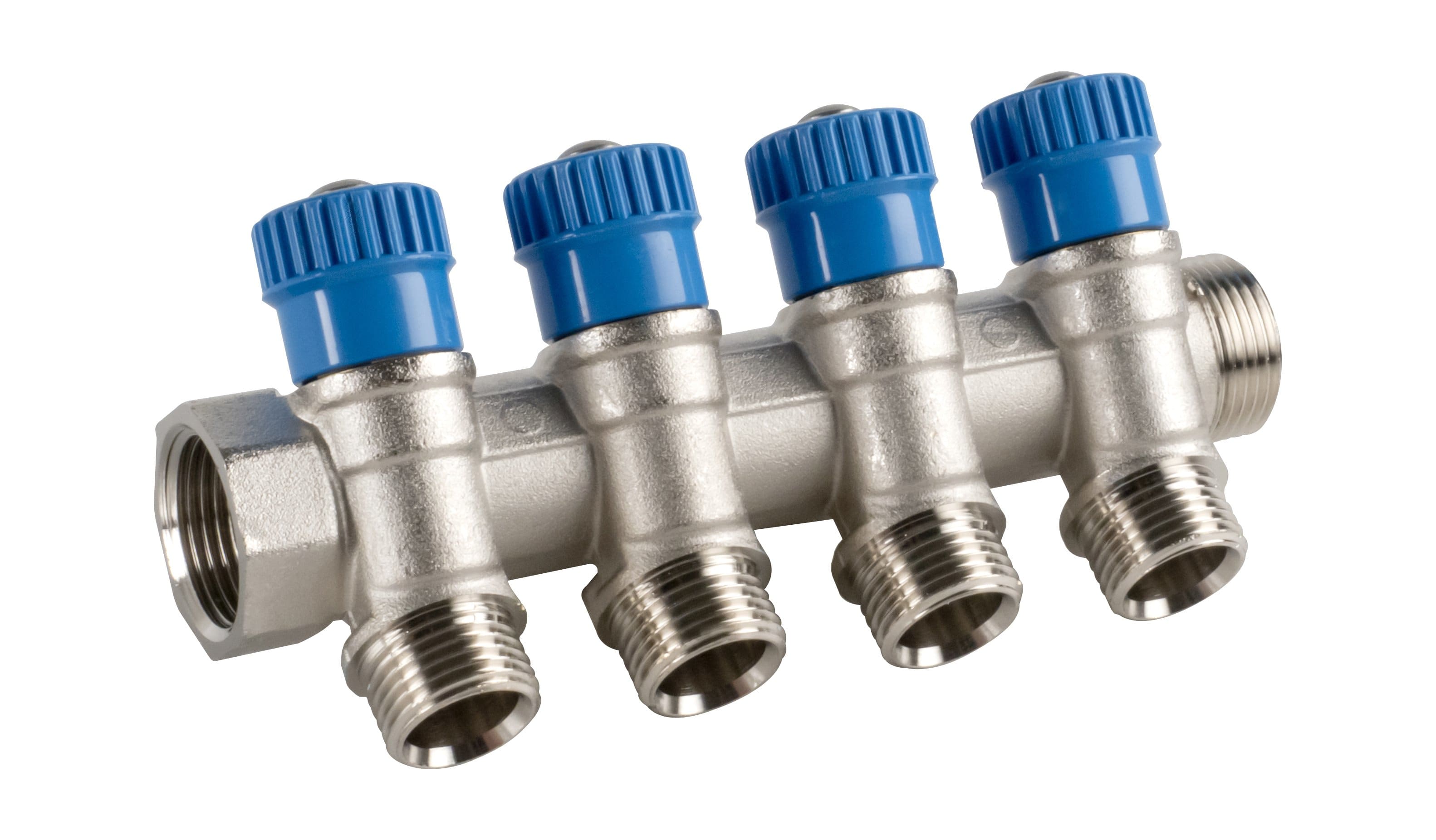 PEXAL BRASS COLLETTORE ø3/4"MF 4DERIVAZIONI ø1/2"M MANOPOLA BLU