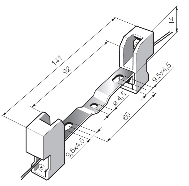 Portalampade a blocchetto steatite 8 A 250 V attacco R7s per lampade alogene 300-500 W, 200 mm cavo teflon PTFE 0,75 mm2 - staffa di fissaggio mediana. Massima temperatura d’impiego continuo del portalampade 350 °C, del cavo 250 °C. Staffa con foro centrale ø 4,5 mm e asole 4,5x9,5 mm interasse 65 mm
