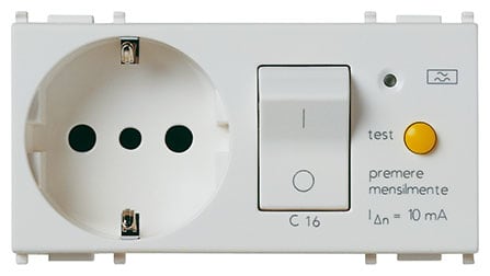 Presa SICURY 2P+T 16 A standard italiano tipo P30 (contatti di terra laterali e centrale), interbloccata con interruttore automatico magnetotermico differenziale 1P+N C 16, 230 V~ 50 Hz, I¿n 10 mA, p.i. 3000 A, Silver - 4 moduli