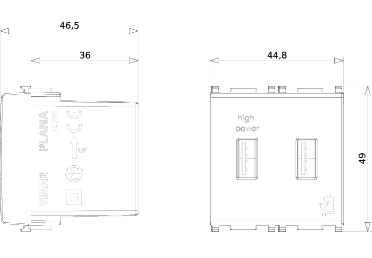 Unità di alimentazione 5 V 2,1 A per dispositivi elettronici, 2 uscite USB frontali, alimentazione 120-230 V~ 50/60 Hz - 2 moduli. Il dispositivo va utilizzato per ricaricare i telefoni cellulari e tutti gli apparecchi elettronici che offrono la possibilità di ricarica da una qualsiasi presa standard USB. Il dispositivo permette di ricaricare due apparecchi contemporaneamente.
