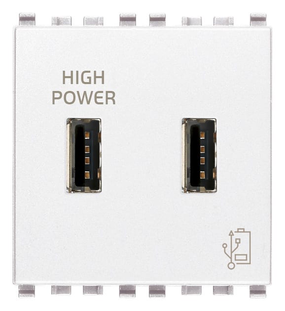 Unità di alimentazione 5 V 2,1 A per dispositivi elettronici, 2 uscite USB frontali, alimentazione 120-230 V~ 50/60 Hz - 2 moduli. Il dispositivo va utilizzato per ricaricare i telefoni cellulari e tutti gli apparecchi elettronici che offrono la possibilità di ricarica da una qualsiasi presa standard USB. Il dispositivo permette di ricaricare due apparecchi contemporaneamente.