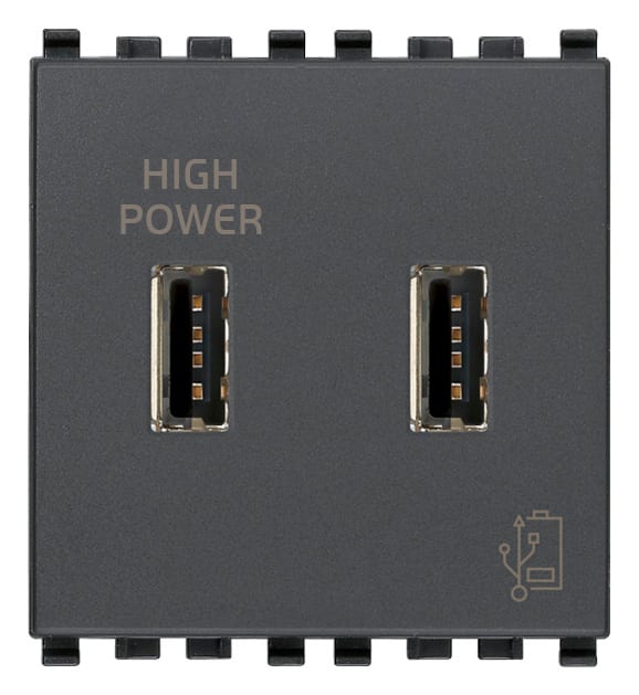 Unità di alimentazione 5 V 2,1 A per dispositivi elettronici, 2 uscite USB frontali, alimentazione 120-230 V~ 50/60 Hz - 2 moduli. Il dispositivo va utilizzato per ricaricare i telefoni cellulari e tutti gli apparecchi elettronici che offrono la possibilità di ricarica da una qualsiasi presa standard USB. Il dispositivo permette di ricaricare due apparecchi contemporaneamente.