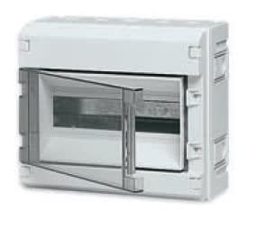 Centralino da parete IP55, con portello trasparente a cerniera orizzontale, 12 moduli, grigio RAL 7035. Guida EN 50022 regolabile peril montaggio di apparecchi fuori standard. Fornito con tappi per ildoppio isolamento. Predisposto per portamorsettiera V51856. Abbinabilealla cassetta di distribuzione V51790 e ad altri centralini conaccessori di giunzione V51905 o V51912.