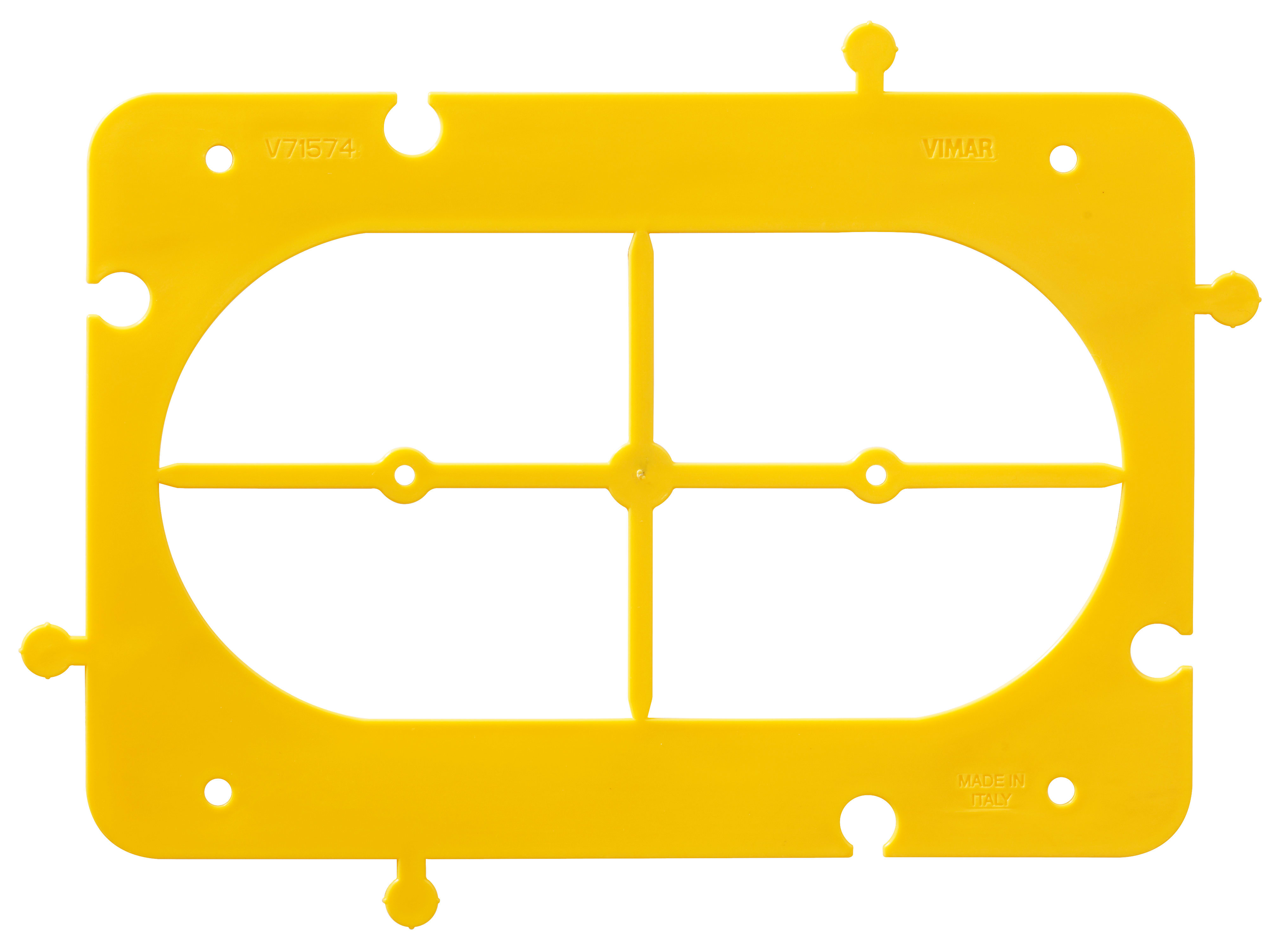Accessorio multifunzione: supporto per installazione di scatole 4 moduli per pareti leggere sul lato interno della parete, dima di centraggio e giunto di unione per montaggio di scatole in batterie orizzontali e verticali.