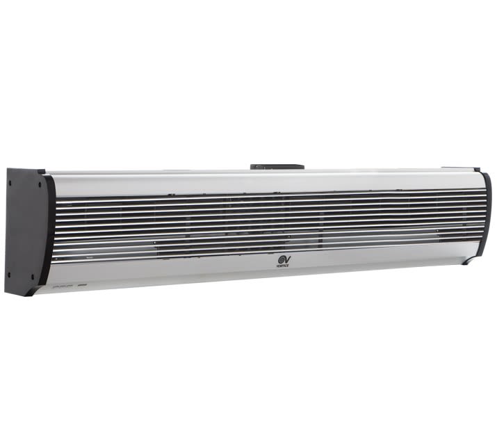 Barriere d’aria per installazione orizzontale fissa in corrispondenza delle porte e, più in generale, delle zone di accesso di locali pubblici, negozi, supermercati o centri commerciali, generano una lama d’aria che ostacola l’ingresso di aria esterna a temperatura diversa da quella desiderata. Particolarmente indicate anche per prevenire l’ingresso di fumo, smog o insetti ed evitare la diffusione di odori tra ambienti contigui. Involucri caratterizzati da pannelli frontali in alluminio spazzolato di colore grigio argento integranti la griglia di aspirazione; pannelli posteriori in lamiera d’acciaio verniciata nera; fianchetti in resina plastica nera. Ventilatori tangenziali, a garanzia di bassi livelli di emissioni sonore, azionati da motori asincroni bialbero a due velocità per il miglior compromesso tra prestazione erogata, temperatura del flusso d’aria generato (nel caso dei modelli con batteria elettrica), e livello di emissione sonora. 2 velocità di funzionamento. I modelli AIR DOOR H hanno batterie elettriche a termoresistori (PTC) caratterizzate da elevate rese termiche e ridotta resistenza aerodinamica, protette contro sovratemperature e picchi di tensione. La specifica logica di funzionamento, che ritarda di 30” l’arresto del ventilatore dopo lo spegnimento della resistenza, contribuisce al loro affidabile funzionamento nel tempo. Alette orientabili, montate in corrispondenza della zona di fuoriuscita dell’aria, permettono di orientare il flusso generato. Consentono risparmio nei consumi perchéevitano la creazione di variazioni termiche e di dispersioni: anche i climatizzatori (in estate) o i riscaldamenti (in inverno) lavorano in modo più efficace, risparmiando a loro volta il proprio consumo. Sono utilizzabili in tutte le stagioni: sono modelli in versione neutra. Grande flessibilità di installazione: la posizione frontale della griglia di aspirazione consente il montaggio anche a ridosso del soffitto nei locali di altezza ridotta (minimo 2.55 m). Facilità e rapidità di installazione, graziealla pratica staffa in dotazione. Possibilità di installazione in serie, per coprire aperture di elevata larghezza. Abbinabili a sensori porta standard presenti sul mercato. Classe di Isolamento: Cl.I .