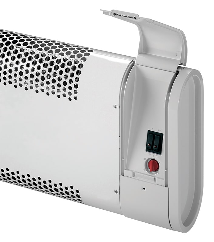 Termoventilatore miniaturizzato da installazione, idoneo per il riscaldamento primario dove un impianto centralizzato sarebbe sovradimensionato o troppo oneroso. • Pannelli frontale e posteriore, griglie superiori ed inferiori in acciaio verniciato con vernice antigraffio grigia • Fianchetti laterali e gruppo comandi in resina plastica autoestinguente V0 di colore grigio • Motoventilatore tangenziale • Resistenza corazzata con dissipatore del calore in alluminio con potenza: 300/600 W • Protettore termico a ripristino manuale • Interruttori luminosi per accensione/spegnimento e per scelta delle potenze elettriche • Termostato ambiente a regolazione manuale con funzione antigelo che garantisce l’accensione automatica del termoventilatore quando la temperatura rilevata dell’ambiente scende al di sotto dei 5°C • Collegabile ad un cronotermostato esterno