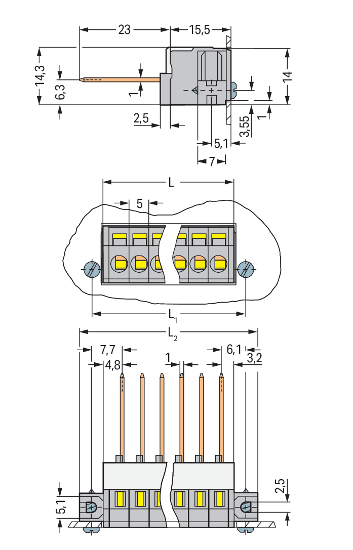 Morsetto passaparete; Connessione wire-wrap/conduttore; Spessore piastra: 1,5 mm; 2,5 mm²; Passo pin 5 mm; 2 poli; CAGE CLAMP®; 2,50 mm²; grigio