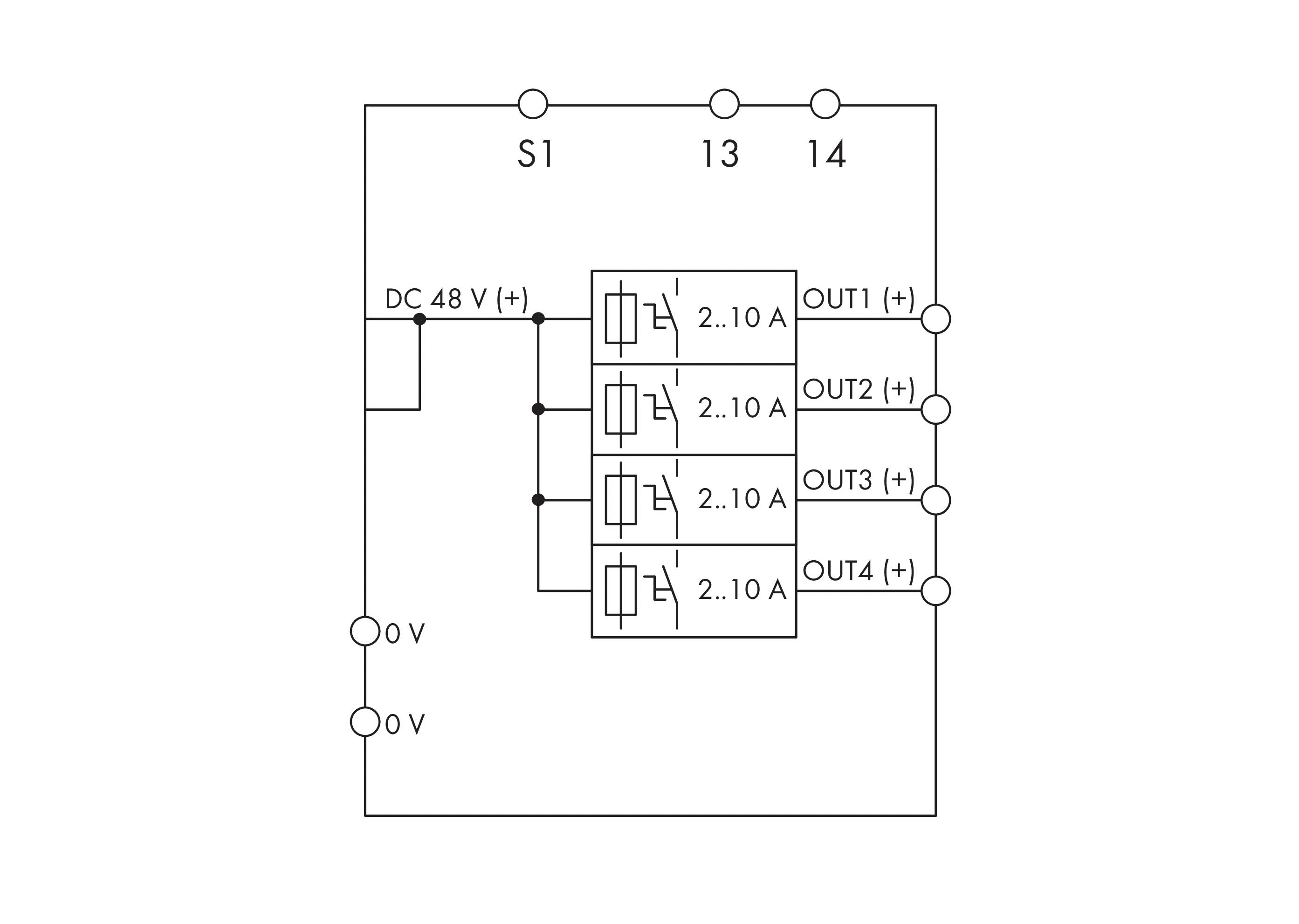 Interruttore di sicurezza elettronico; 4 canali; Tensione di ingresso 48 V DC; regolabile da 2 a 10 A; Contatto segnale