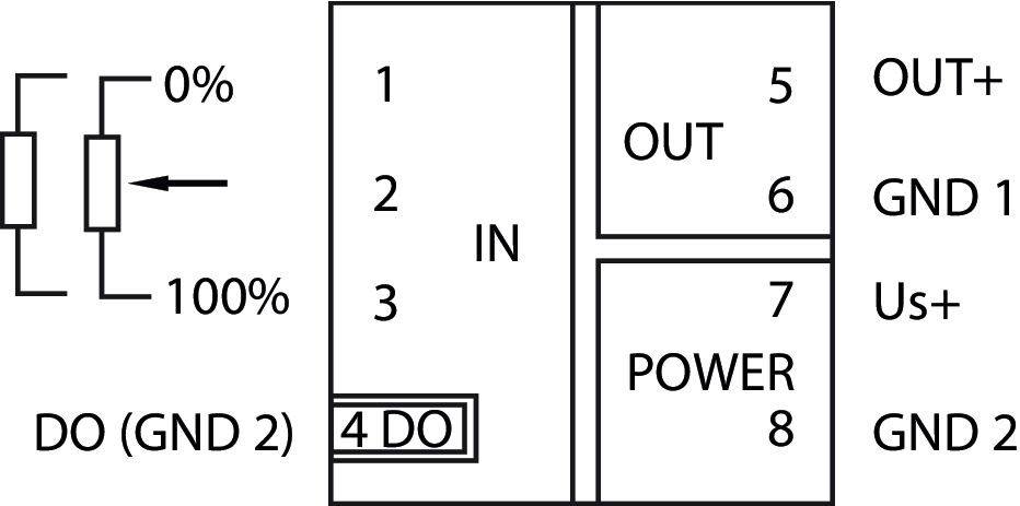 Trasduttore di posizione per potenziometro; Segnale uscita di tensione e di corrente; Uscita digitale; Configurazione mediante software; Tensione di alimentazione: 24 V DC; Larghezza modulo 6 mm; 2,50 mm²