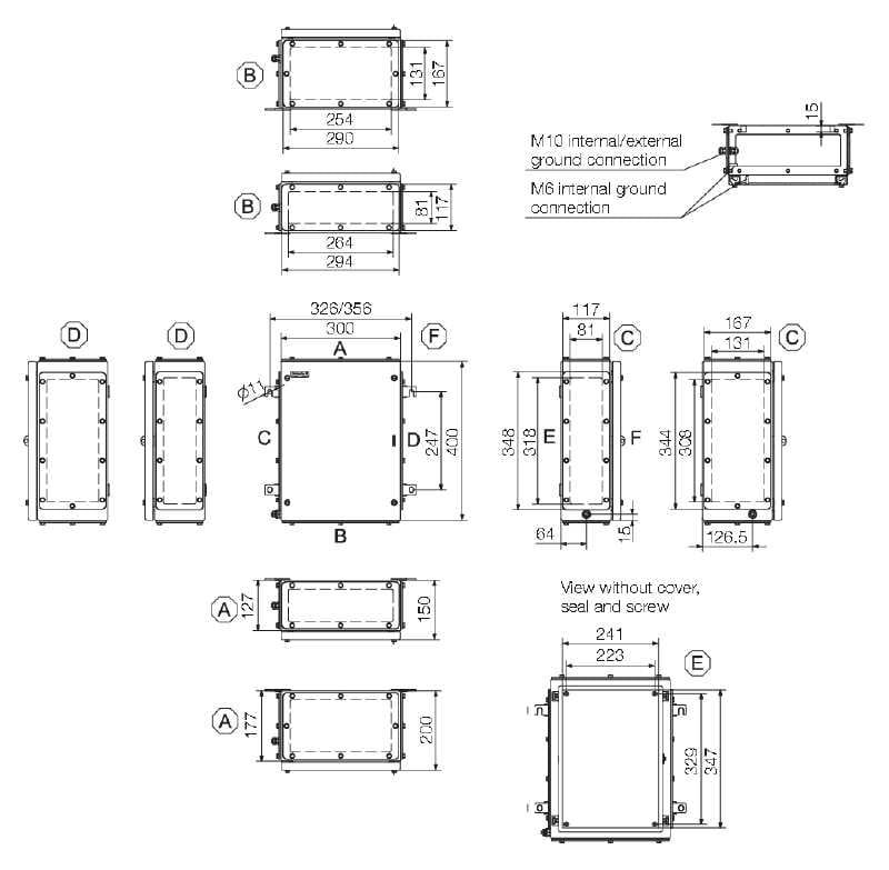 Custodia in metallo adatta all'uso in zone a rischio di esplosione. I fori per il montaggio sono posti all'esterno dell'area di tenuta stagna. Il montaggio a muro può essere realizzato utilizzando fori di montaggio o piedini di montaggio.