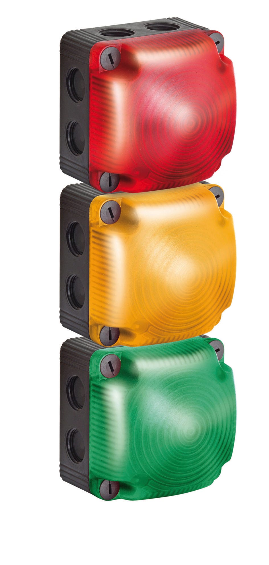 LED-Dauerleuchte in formschönem, quadratischen Design Beliebige Ampelkombination durch innovatives Verbindungsstück möglich Minimaler Installationsaufwand dank Gewinde-Membran-Kombination